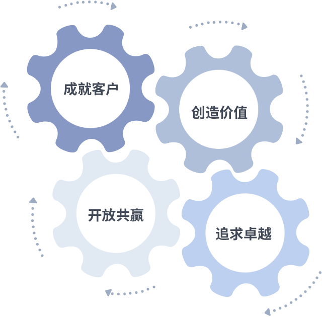 成就客户是一切决策的出发点,创造价值是衡量所有工作的标准,追求卓越是摇钱树娱乐做事做人的态度,开放共赢是摇钱树娱乐的格局也是最终的结果。价值观的齿轮环环相扣,推动着组织里的每个人不断向前。